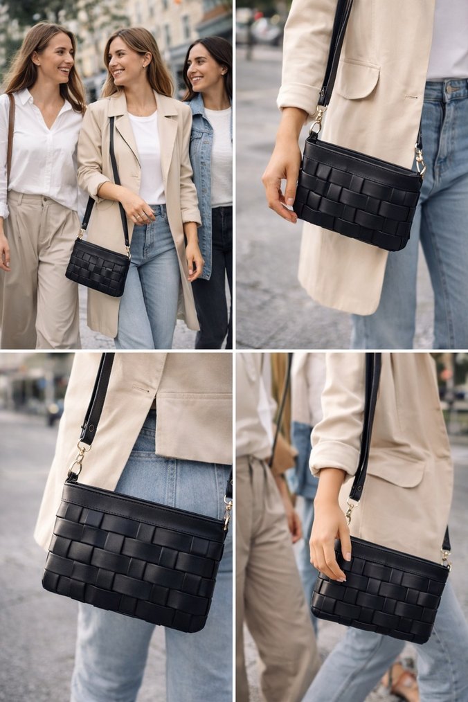 Siyah deri kadın çanta, kare desenli ve kemerli tasarıma sahiptir. Çıkarılabilir askısı ile günlük kullanım için uygundur. Elde tutma askısıda vardır