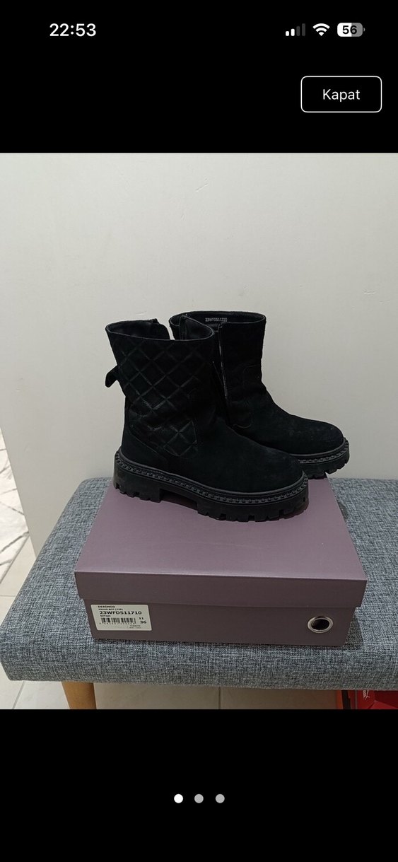 Siyah süet kadın botları, kare desenli ve kalın topukludur.36 numara.Bir iki kez kullanıldı tertemiz.Dolabımda yer olmadığı için satıyorum