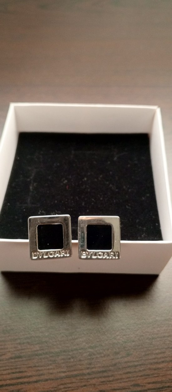 Siyah kare tasarımlı erkek kol düğmeleri, cesur sokak stili ve iş görünümü için uygun. Üzerinde Bvlgari markası yazılıdır.