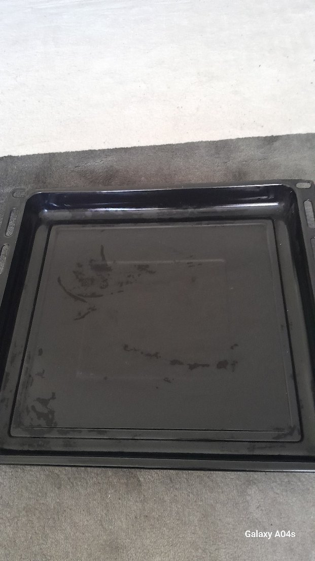 Kenarlarında kulplar bulunan, çeşitli yemekler için uygun siyah kare fırın tepsisi. Düz yüzeye ve yükseltilmiş kenarlara sahiptir.