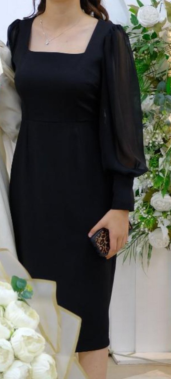 Siyah, kare yakalı, uzun tül kollu, fitted midi elbise, resmi davetler için uygundur. sadece bir kere giydim hiçbir defosu yoktur