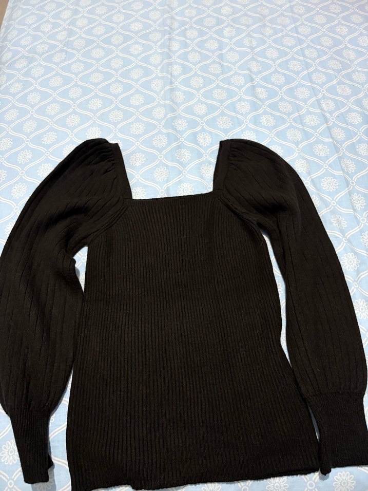 Siyah kare yaka, uzun kollu, vücuda oturan triko kazak, gündelik kullanım için rahat ve trend bir tarz sunar.