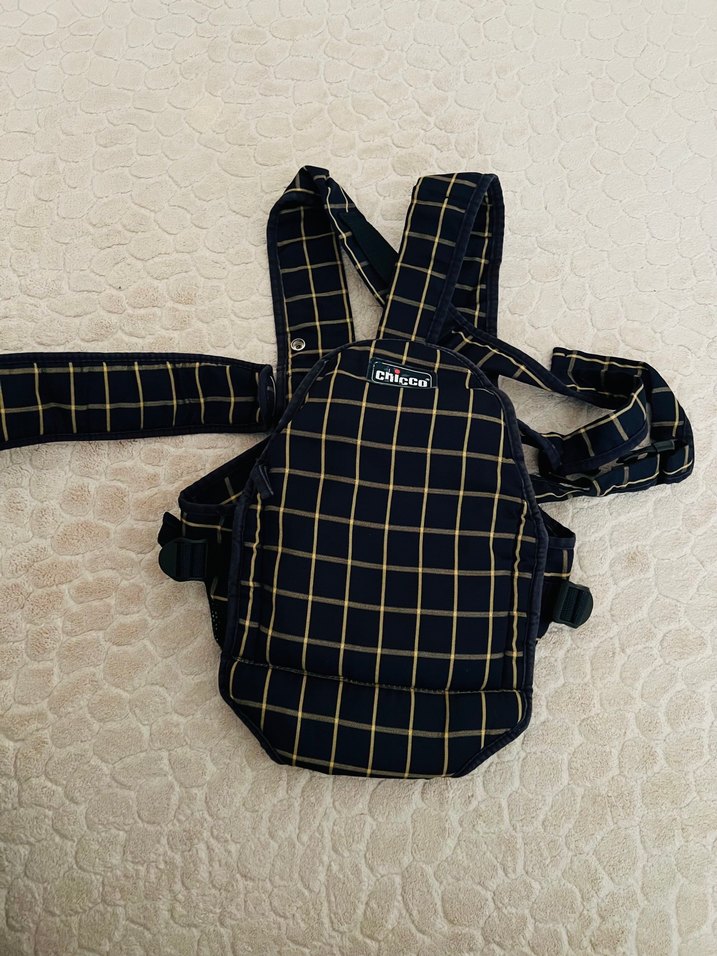 Ayarlanabilir askılara sahip siyah kareli bebek taşıyıcı, rahat taşıma sağlar.