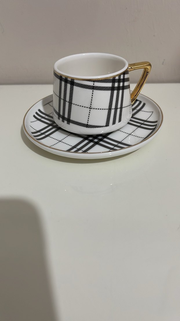 Siyah kareli desen ve altın saplı beyaz fincan ile tabak seti, klasik ve şık bir tasarıma sahiptir. ☕ fincan arow sosluklar Karaca