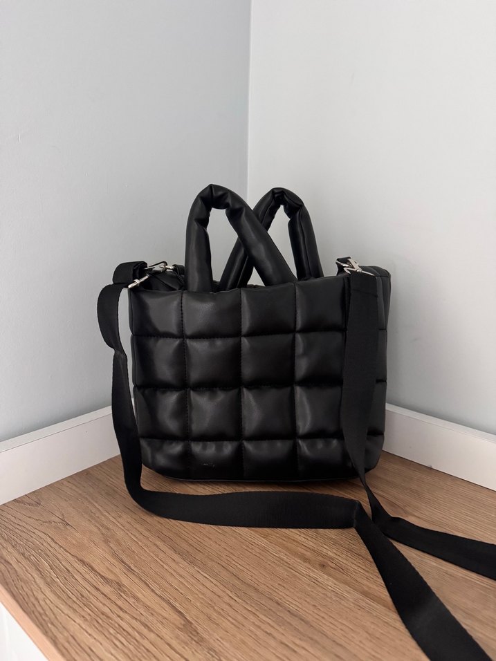 Kareli dolgulu desene sahip siyah deri çanta, tokalı detaylarla tamamlanmıştır. Kısa sapları ve ayarlanabilir uzun askısı vardır. Günlük kullanım için uygundur.