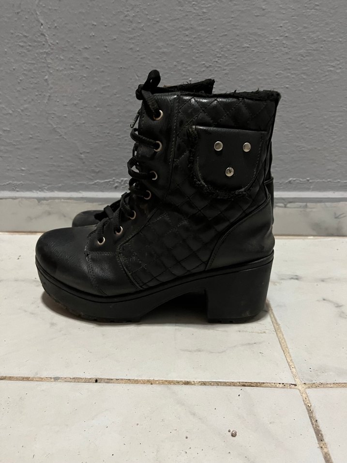 1 kere giyildi bir kusuru yok Siyah deri, kareli desenli, tokalı ve bağcıklı, blok topuklu gotik tarzda botlar.