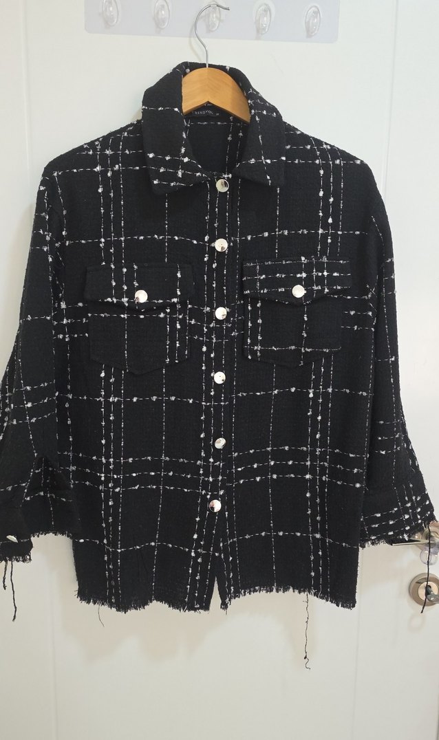 Siyah ve kareli desenli, düğmeli, uzun kollu, notched lapel yakalı, rahat kesim kadın ceketi. Önünde iki cep bulunur, yumuşak kumaştan üretilmiştir.