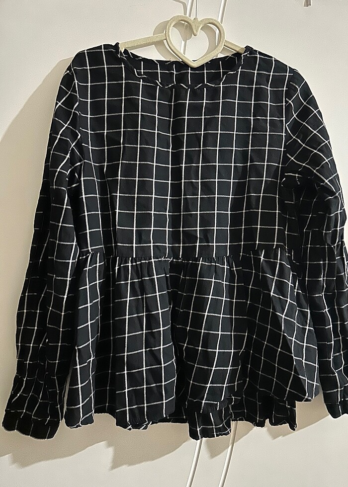 Siyah kareli düğmesiz bluz. Keten karışımlı kumaş. Herhangi bir sorunu yok bi kaç kez giyildi