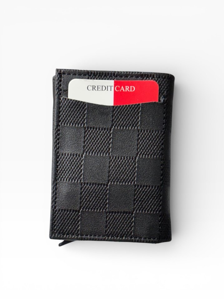 Kareli desenli siyah erkek cüzdan, ön cebinde kredi kartı ile iş ve sokak stilini bir araya getirir.