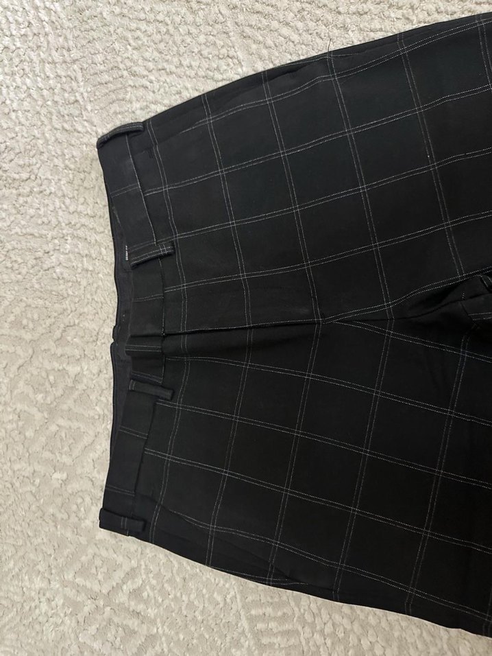 Siyah kareli, regular fit kumaş pantolon, tokalı detaya sahiptir. Ofis için uygun, sentetik yumuşak kumaştan üretilmiştir.