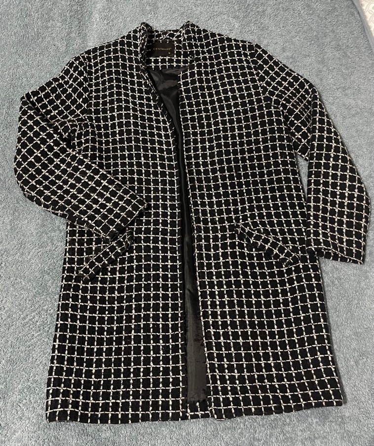 Düğmeli, uzun kollu ve siyah kareli desenli kadın kaban. Regular fit, ve kesimli yakaya sahip, günlük kullanıma uygun.