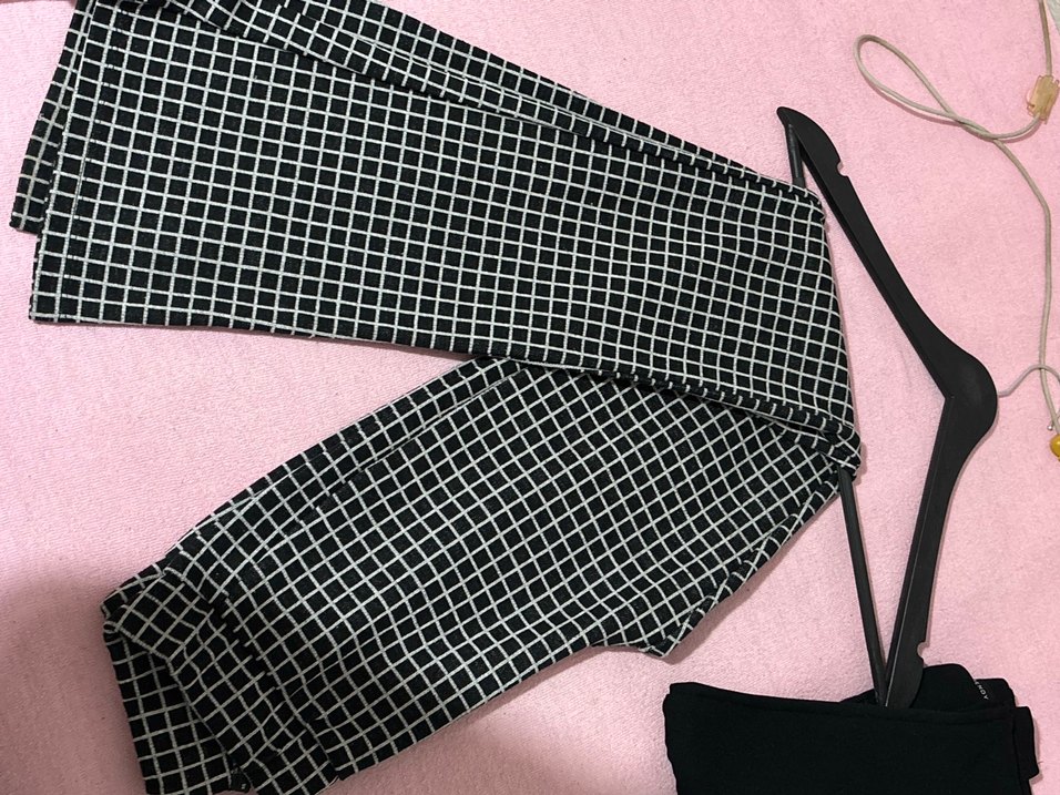 Siyah kareli desene sahip, elastik bel bantlı, normal midi boyda, dar kesim kadın kumaş pantolon. Sokak stili için uygun, günlük kullanıma ideal. Çok severek giydim artık giymiyorum