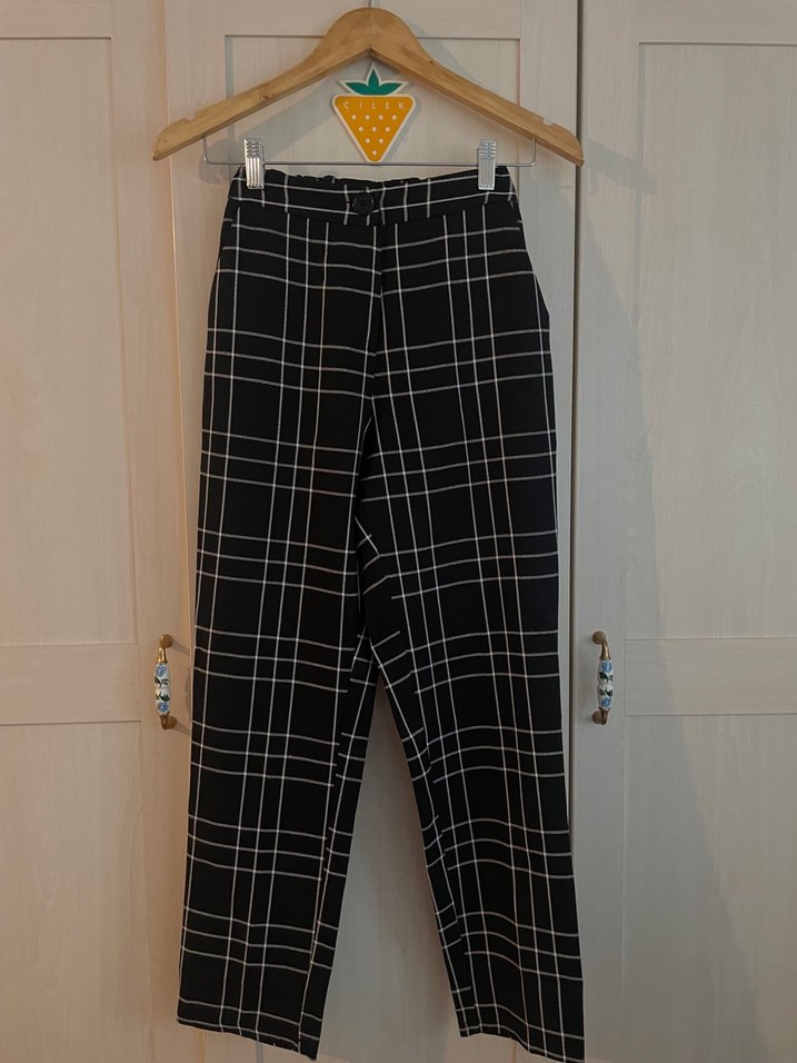 Siyah kareli, regular fit ve normal boyda kadın kumaş pantolon. Tokalı detayıyla ofis şıklığı ve trend rahatlığı sunar.