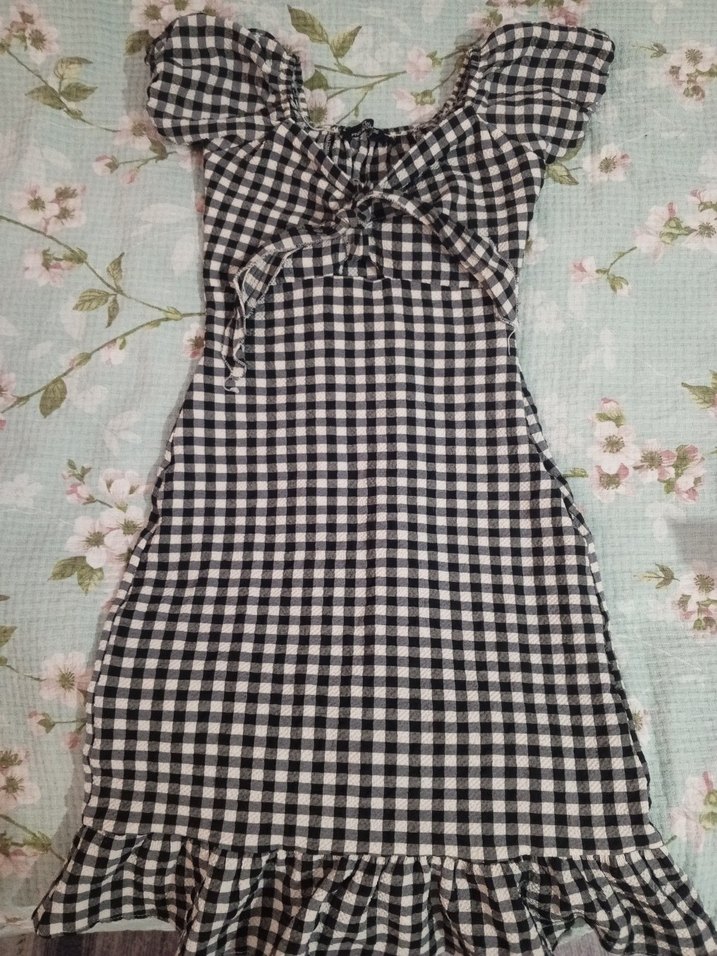 Dar kesim siyah kareli midi elbise, fırfır detaylıdır.s bedendir minik dekoltesi vardır(3.foto) ve tek kusuru fermuar kısmın biraz kötü olması ama çekiliyor sıkıntı yok uzaktan da belli olmuyor yan kısma denk geliyor kolun altına marka temsilidir