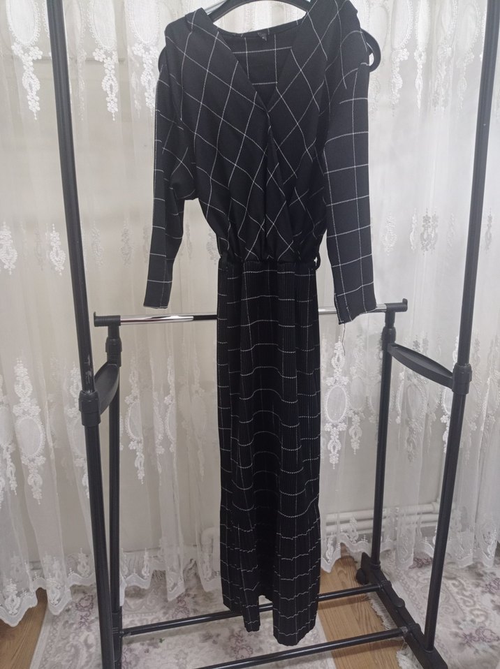 Siyah kareli uzun elbise, kemerli ve askısız yaka detayına sahip. Sentetik kumaştan, regular kesim ve sokak stiline uygun. hamile iken 1 2 defa giydim kumaşı esnek çok rahattı