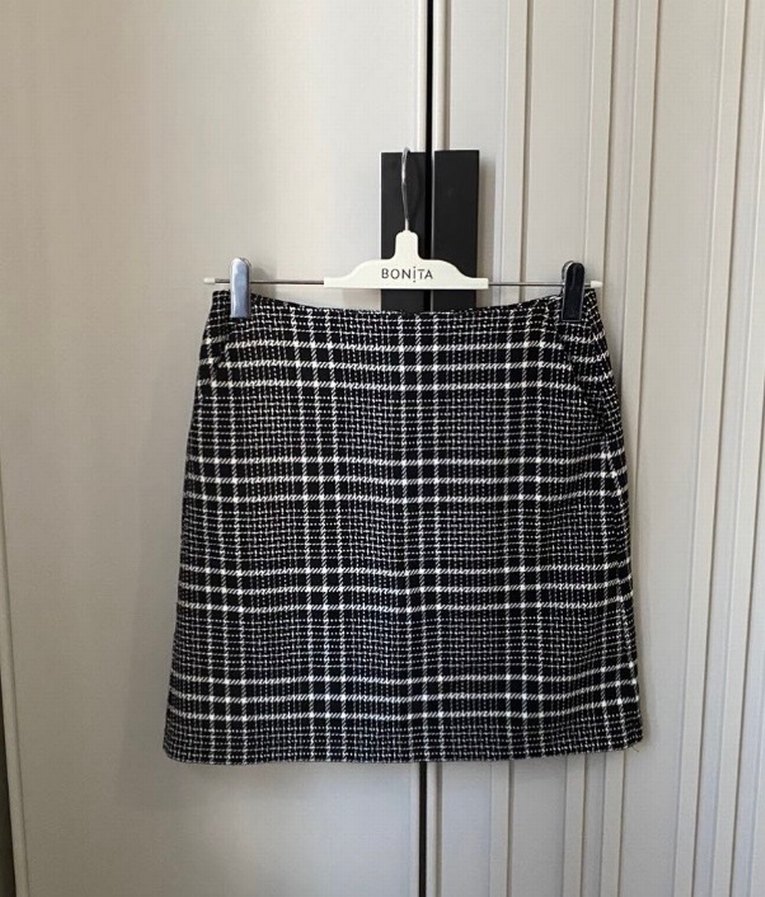 Siyah kareli desene sahip, dar kesim mini etek. Günlük kullanıma uygun şık bir sokak stili parçası.