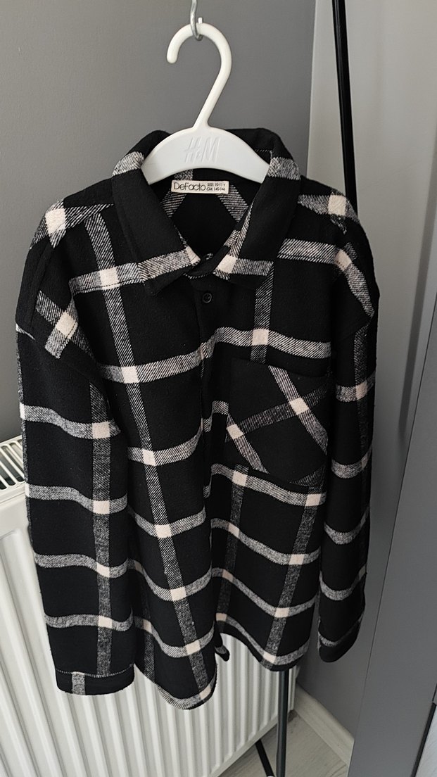 Düğmeli, siyah kareli çocuk oduncu gömleği, yumuşak sentetik kumaştan, uzun kollu ve rahat bol kesimdir.