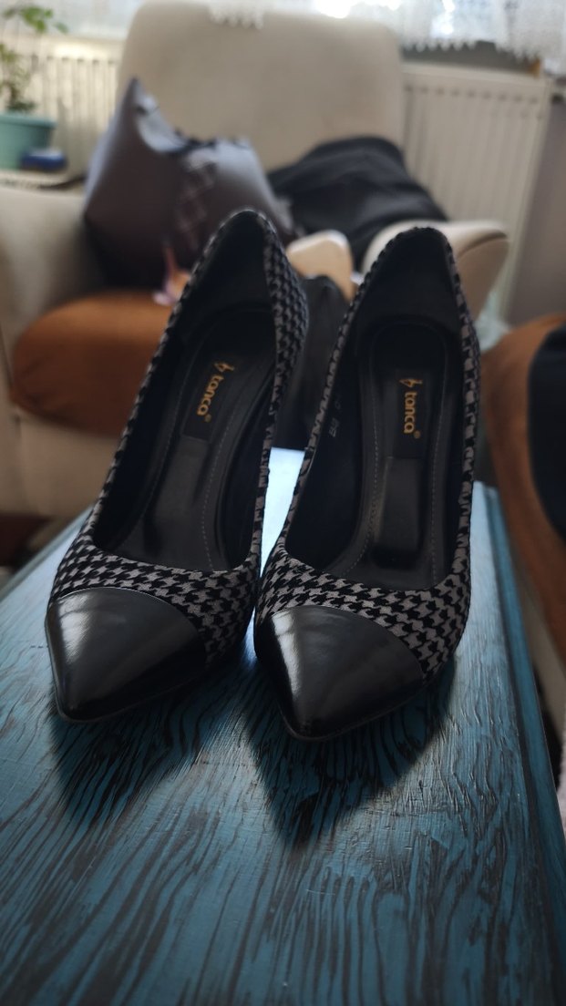 Siyah kareli, pilili detaylı ve sivri burunlu stiletto topuklu ayakkabılar. Kauçuk malzemeden üretilmiş, klasik şıklık ve günlük sokak stili için uygun.