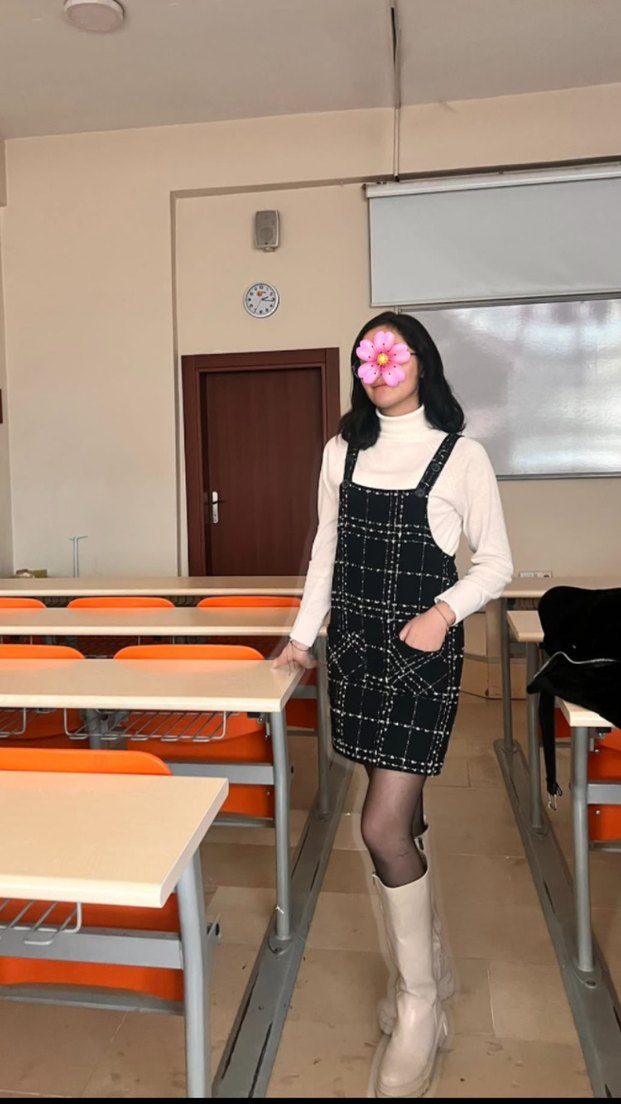 Siyah kareli triko midi elbise, halter yaka ve ince askılı kollara sahip, günlük kullanım için zahmetsiz şıklık sunar.