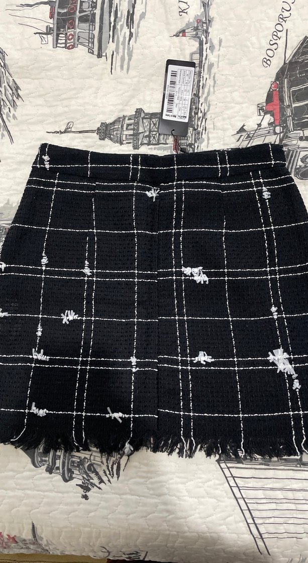 Siyah kareli ve triko dokulu bu dar kesim mini etek, sentetik kumaştan yapılmıştır. Normal midi boyda ve püsküllü kenarlara sahiptir, günlük sokak stiline uygundur.