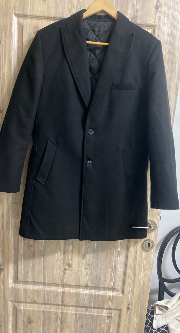 Siyah kaşe kumaştan, normal kesim, düğmeli erkek kaban. Uzun kollu ve midi boyda, ofis için uygun klasik tasarım. Bir veya iki kez anca giyildi yeni gibi duruyor 2 kol arası 54 cm uzunluğu 88 cm dir resimlerde ışıktan farklı çıkmış olabilir canlı siyahtır