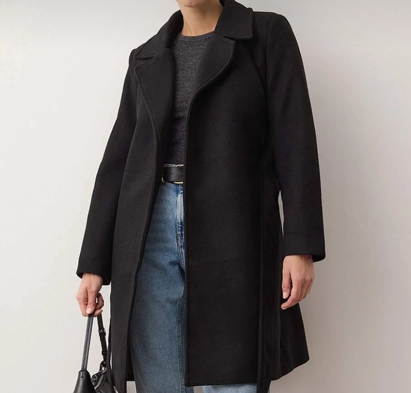 Kemerli, uzun kollu ve yakalı siyah kaban. İç kısmı rahatlık için düzgün astarlıdır. 36 beden Az kullanıldı