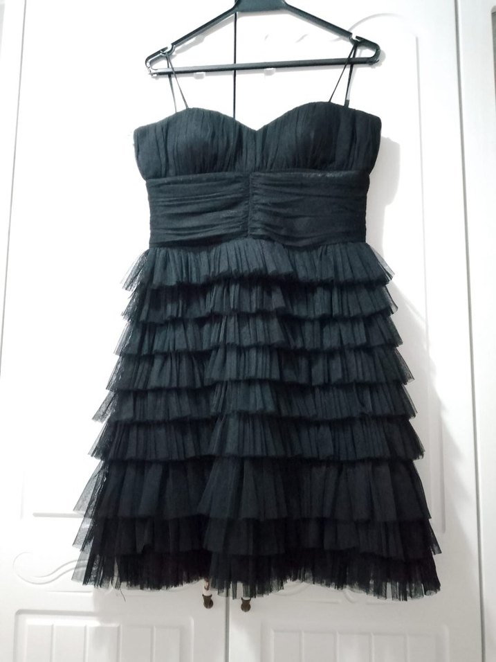 Siyah kat kat fırfırlı midi abiye elbise, straplez ve ince askılı, fit kesim ile gotik parti tarzı için uygun.