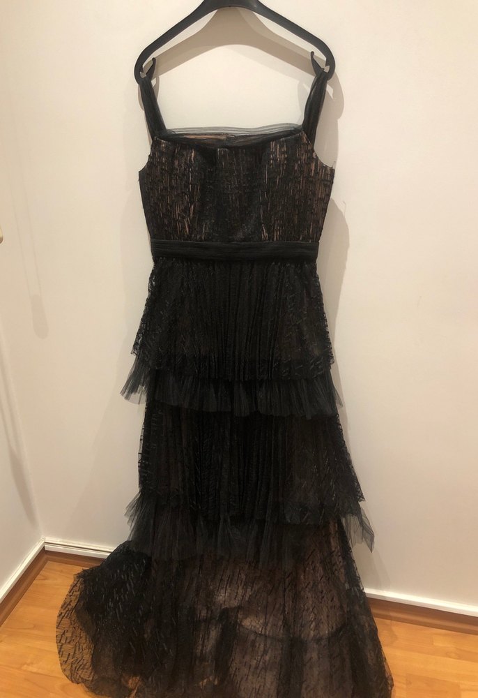 Siyah, kat kat özgür masur tasarım ipekyol 40 beden içi astarlı dantel omuzları şifon düşük omuz arkadan fermuarlı uzun şık abiye 1 kez giyildi hasarı yok belinde kuşak detay