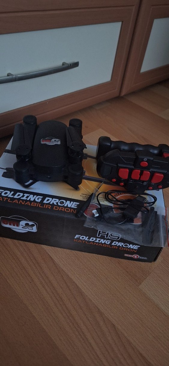 Siyah katlanabilir drone model kiti, uzaktan kumanda ve USB şarj kablosu ile birlikte. Kompakt tasarım, kolay saklama sağlar. WiFi ve kamera destekli