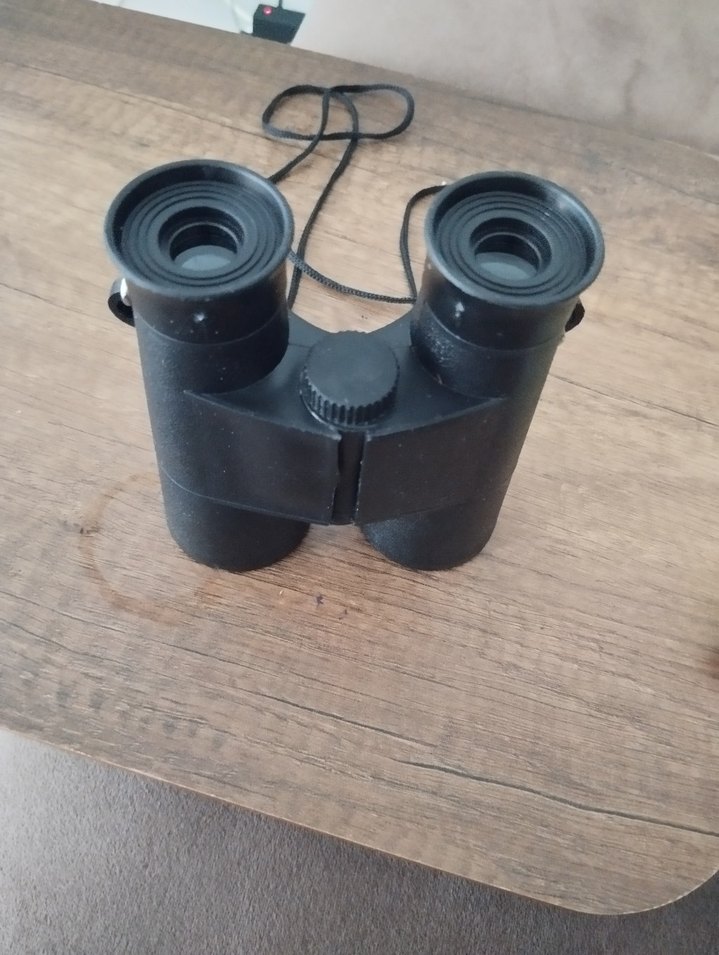Ayarlanabilir odak ve taşıma için ip kayışı bulunan katlanabilir siyah dürbün. Kompakt ve dış mekan kullanımı için uygun.