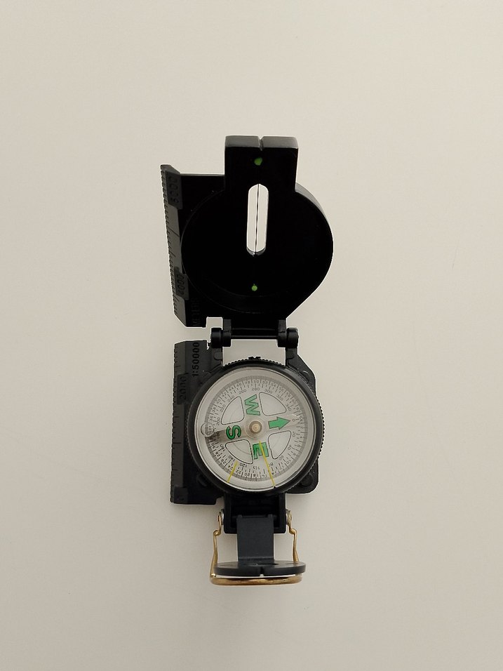 Yönlendirme için işaretli, siyah katlanabilir pusula. Eski bir üründür.