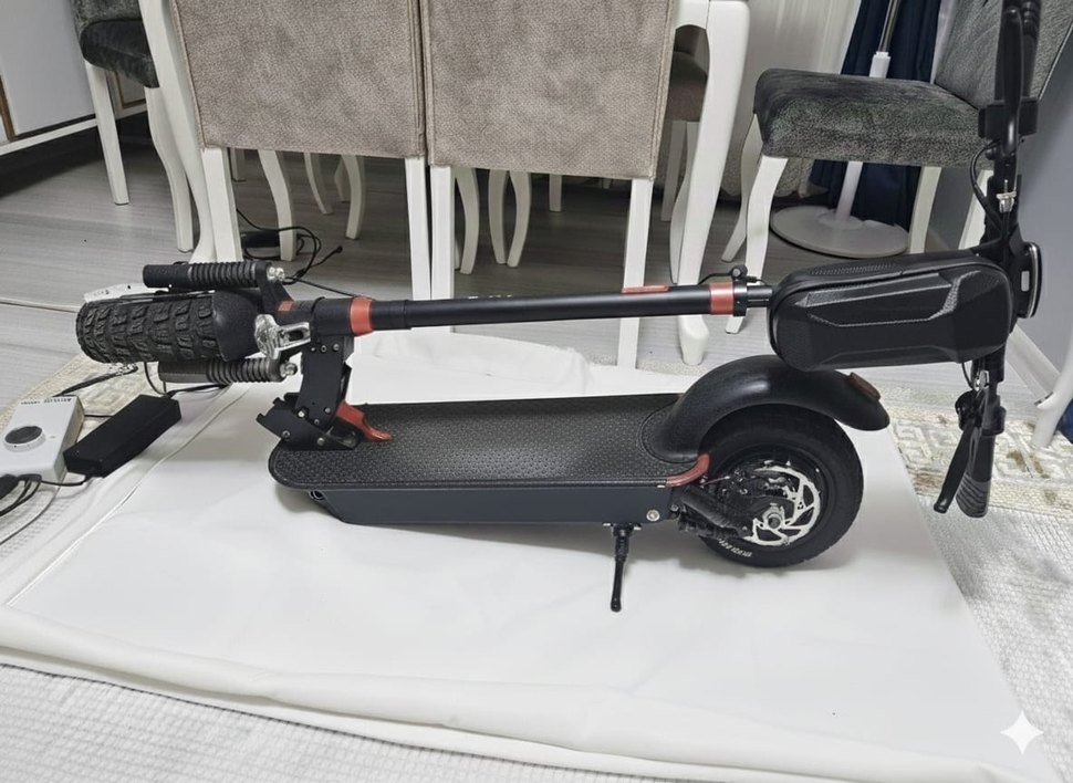 Dayanıklı çerçeveli siyah katlanabilir çocuk scooterı, tutuş için dokulu ayak tahtası, yan ayaklık ve arka disk fren içerir.