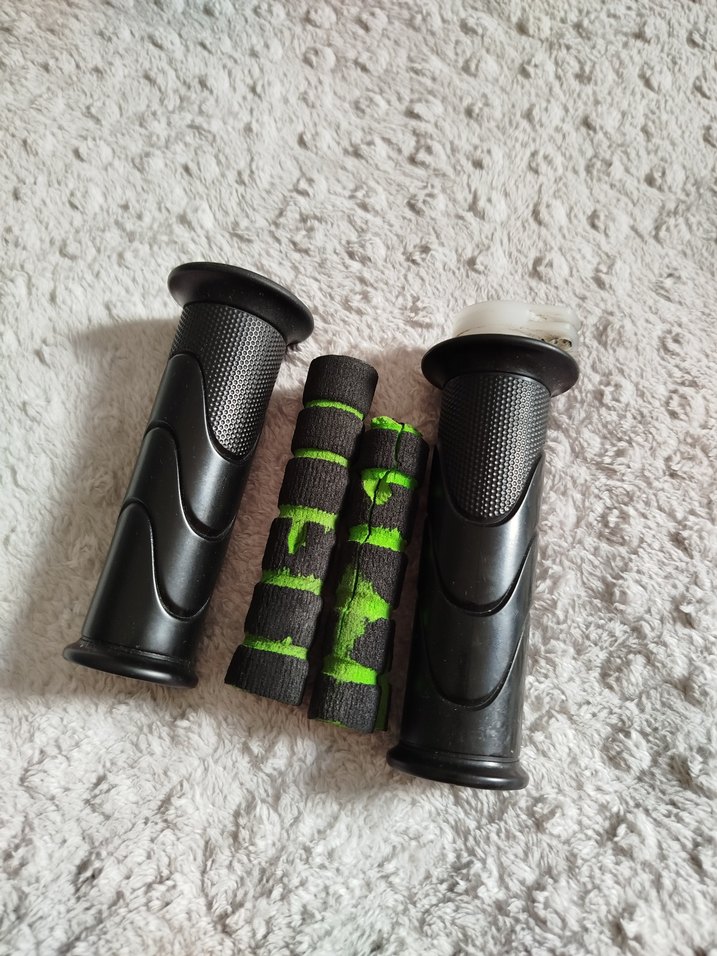 Siyah dokulu motosiklet kolları ve yeşil-siyah köpük saplar, rahat tutuş ve kontrol sağlar.