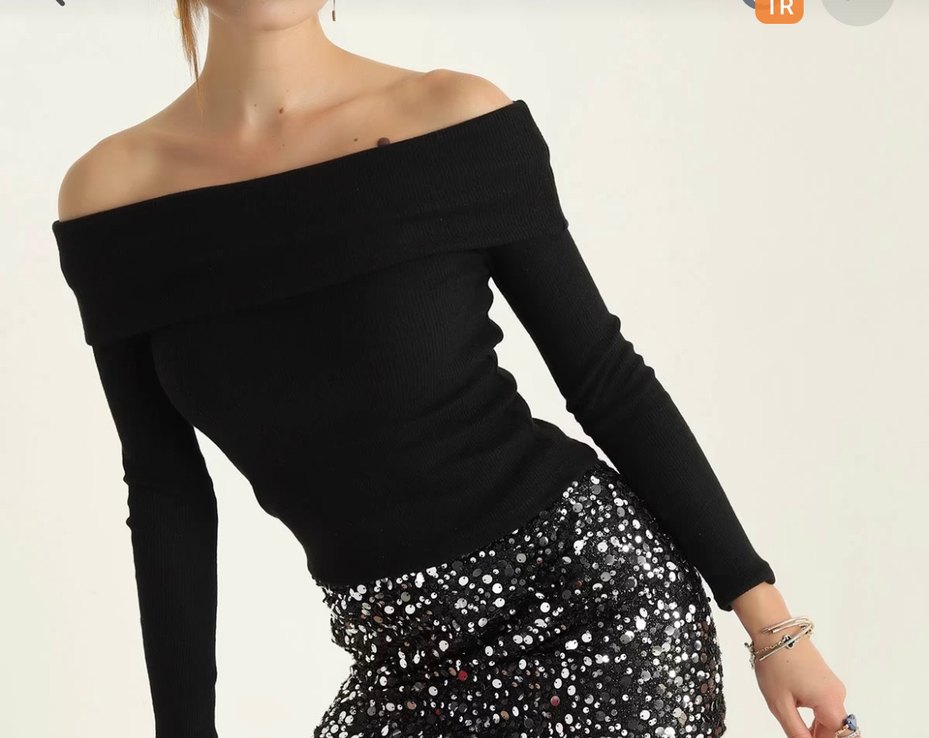 Kadın siyah uzun kollu, yüksek ve katlanabilir yakalı, ince ve rahat triko kazak