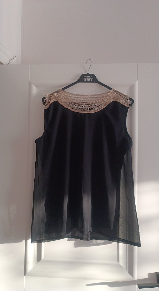 Siyah, kolsuz, şifon, kayık yakalı astarlı kadın bluz
