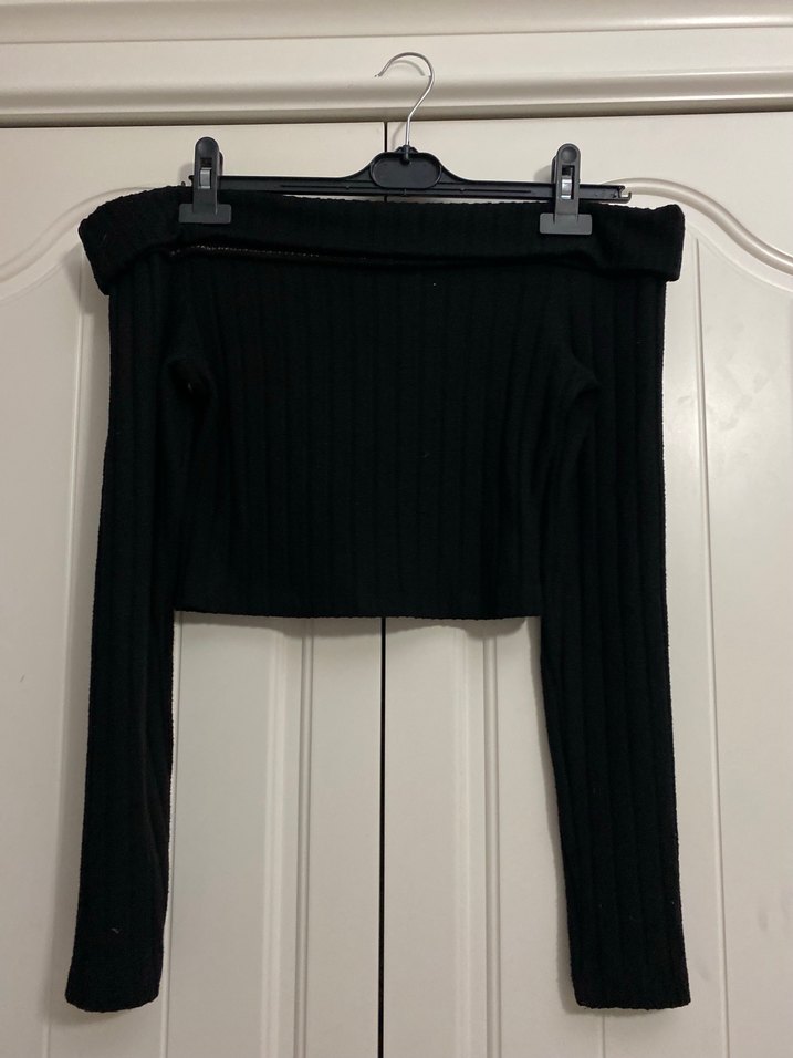 Siyah renkli, kayık yaka ve uzun kollu, kemerli ve vücuda oturan kadın bluz. Midi boy ve sentetik kumaştan, minimalist gotik tarza uygun günlük kullanım için.