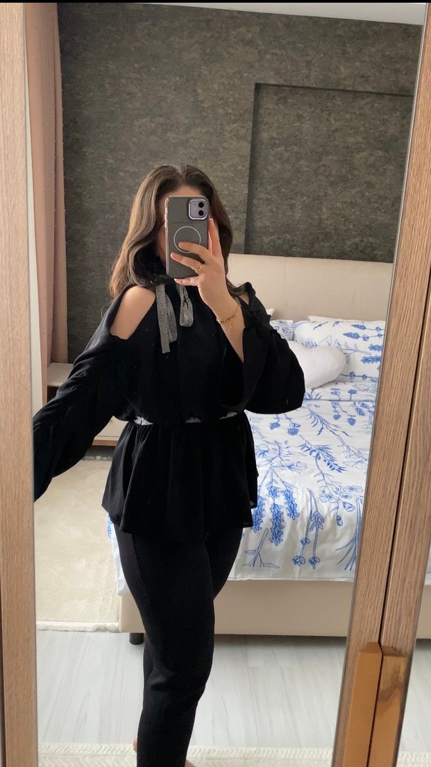 Siyah, kayık yaka, kemerli ve uzun kollu bu bluz, salaş kesim ve ipeksi kumaştan üretilmiştir. Midi boyda ve gotik tarzda, günlük kullanım için uygundur. 36-38 beden uyumludur.