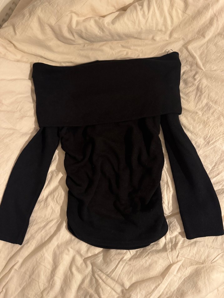 Siyah renkte, kayık yaka kenarları büzgülü bluz