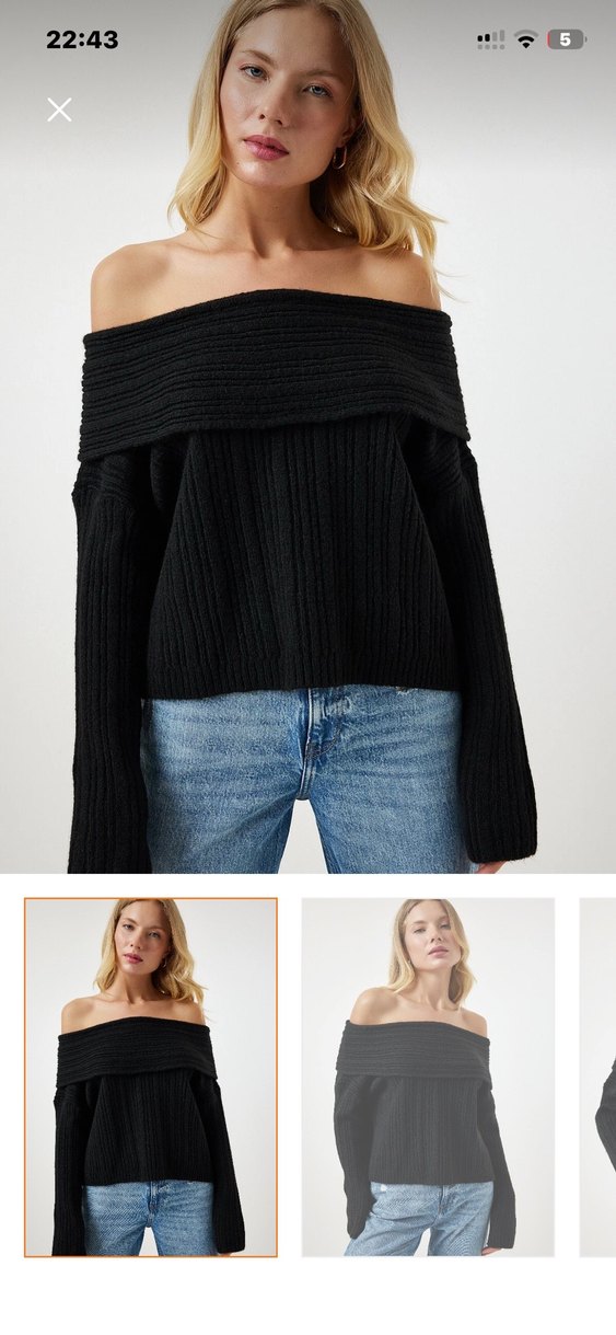 Siyah renkli, kayık yaka ve uzun kollu örgü kadın kazak. Salaş kesimi ve midi boy uzunluğuyla günlük kullanıma uygundur.