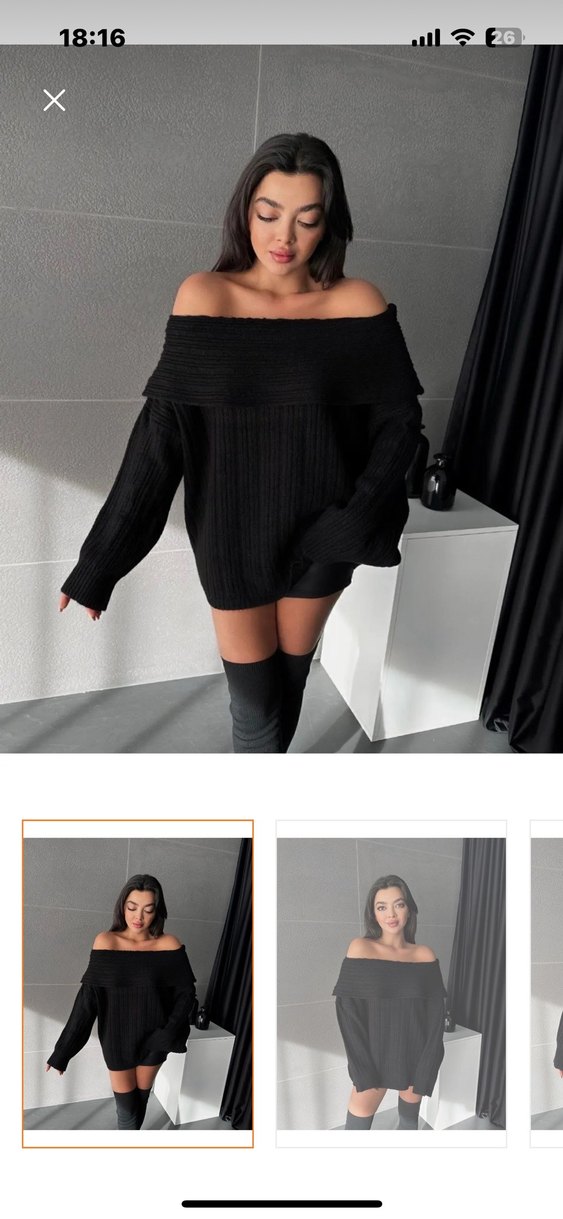 Bu siyah örgü kazak, kayık yaka ve bol kesime sahiptir. Uzun kollu, kısa boyda ve gündelik gotik tarz için uygundur.