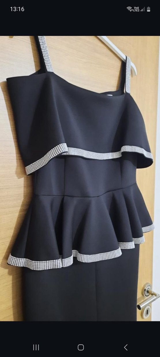 Siyah mini elbise, straplez yaka ve ince askılıdır. Parlak işlemeli fırfır detaylarıyla şık ve günlük kullanıma uygundur. ✨
