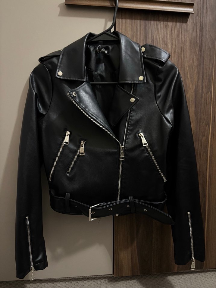 Siyah deri biker ceket, fitted kesim, keskin yaka ve çoklu fermuarlı cepler içerir. Kayışlı bel kemeri ve kayışlı kollara sahip, günlük kullanıma uygun grunge punk tarzı. Hiçbir sorunu yoktur