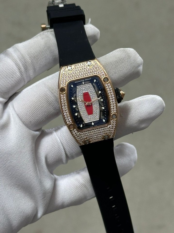 Siyah kayış ve kristallerle süslenmiş altın renk kasaya sahip, renkli kadranlı klasik ve modern tarzda bayan kol saati. ⌚