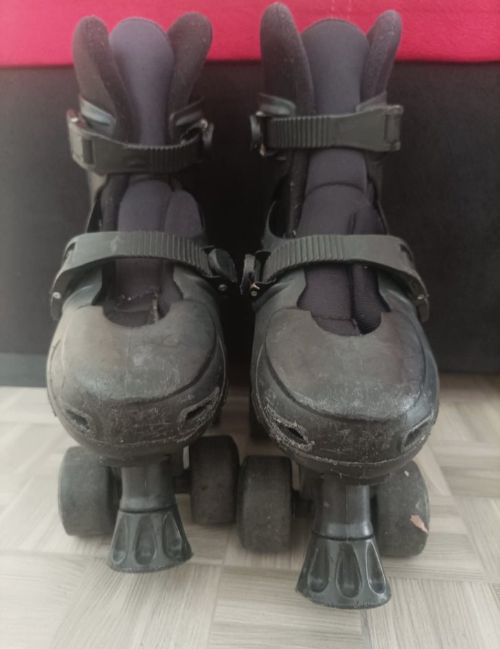 Tokalı kayışlara sahip siyah kaykay pateni, kauçuk malzemeden. 4 tekerlekli 35 36 37 38 ayak numarası olanlar giyebilir