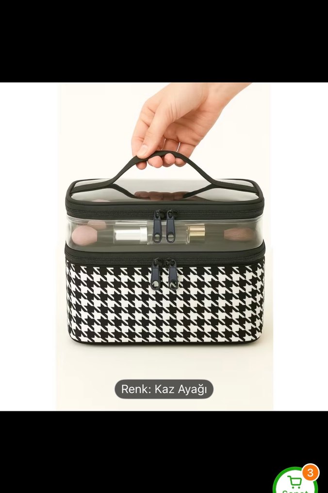 Siyah kaz ayağı desenli, plastik malzemeden yapılmış, fermuarlı ve elde taşınabilir kadın makyaj çantası. Günlük ve iş ortamı için uygundur. İki desen seçenekli sipariş için ilan açtırınız.