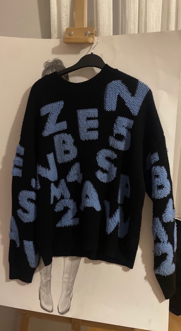 Lacivert renkli, uzun kollu, yuvarlak yakalı örgü kazak. Desenli ve rahat kesim, midi boyda, sokak modasına uygun.
