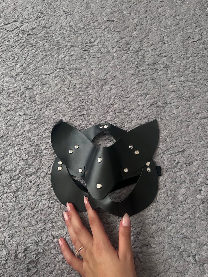 Metal perçin detaylı, siyah deri kedi şeklinde aksesuar maskesi