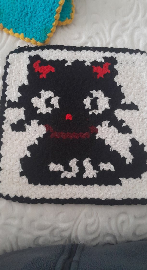 Kırmızı göz ve burunlu siyah kedi desenli, dokulu yapıda banyo süngeri.