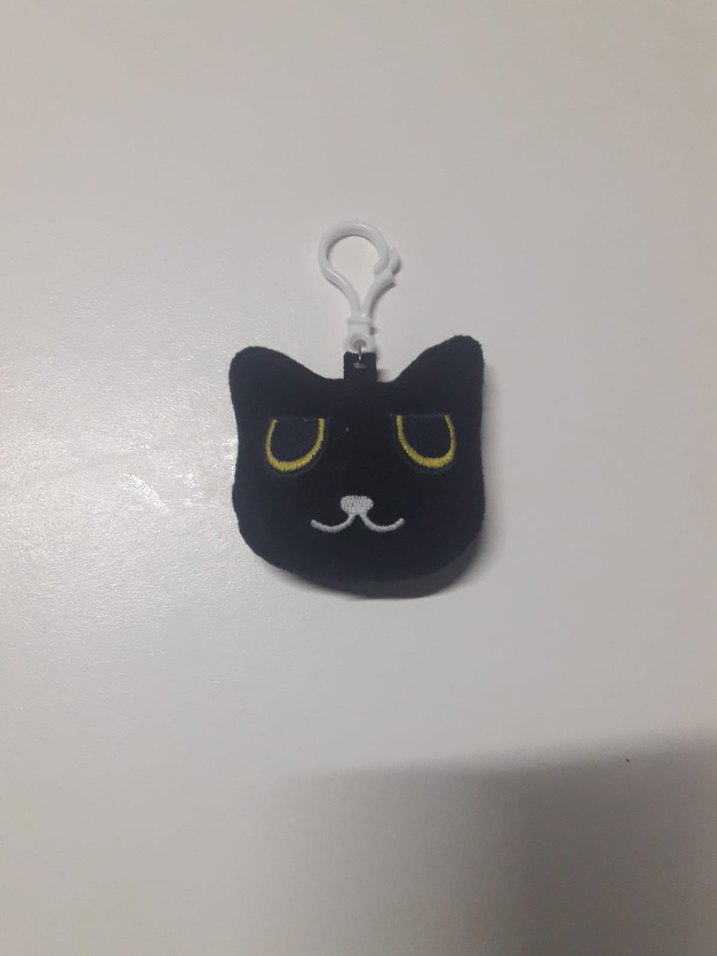 Sarı gözleri ve beyaz burun işlemeli siyah kedi figürlü, kolay takılabilen plastik klipsli anahtarlık.