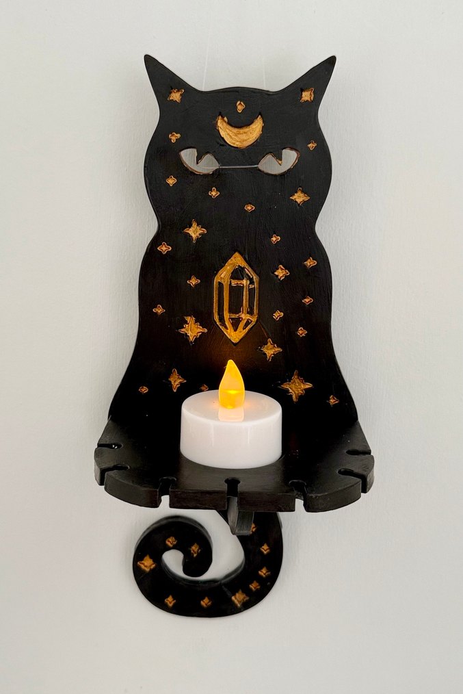 Altın yıldız ve ay detaylı siyah kedi figürlü mumluk, küçük LED mum ile birlikte. Mekâna mistik bir hava katar. ️